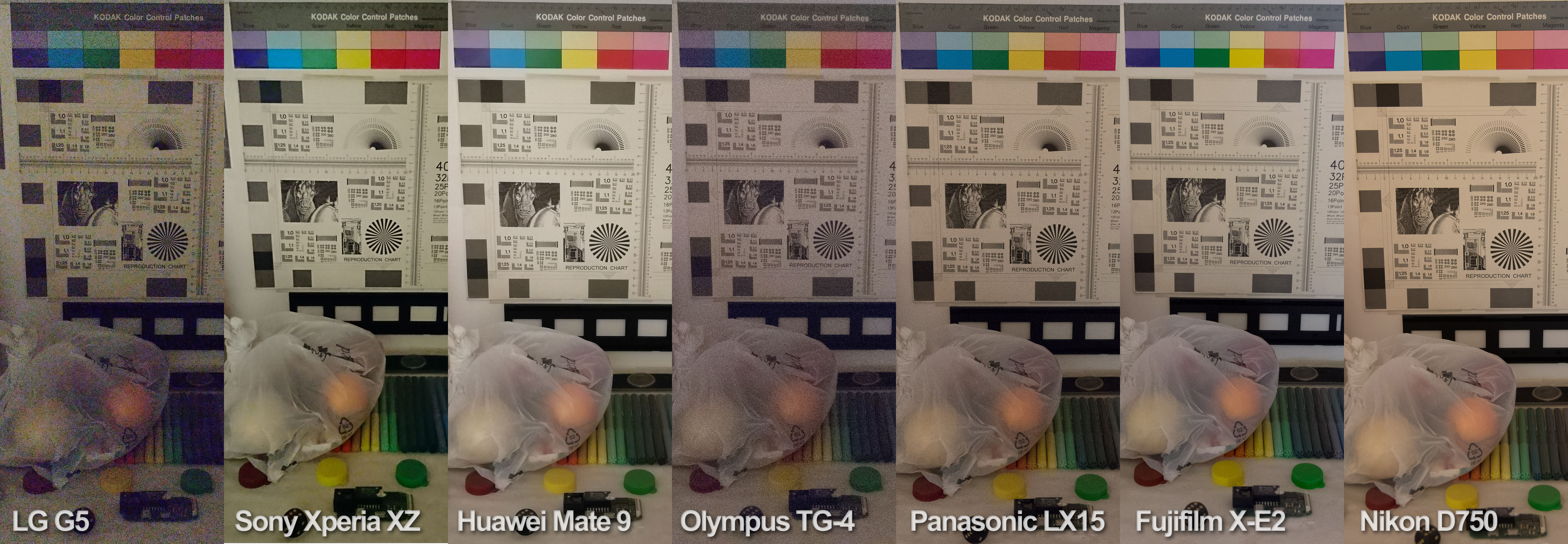 Huawei Mate 9 je, recimo, gladko povozil Olympus TG4 pri občutljivosti ISO 3200. Tudi Sony Xperii XZ je to delno uspelo, saj ji je uspelo dobiti več podrobnosti kot Olympusu, pri barvnih prehodih pa je izgubljal. Snovalci so algoritme raje usmerili v iskanje ostrih robov kot podrobnosti, kar je nekako smiselno. Praviloma slik v polni ločljivosti ne objavljamo, zato nam je ostrina na robovih pomembnejša. iPhone ima najvišjo ločljivost ISO 1600, ki je v formatu RAW še vedno uporabna in konkurenčna. LG G5 je pri visoki ločljivosti praktično nekonkurenčen in si z njim v slabih svetlobnih razmerah ne boste veliko pomagali. Čeprav Xperia XZ odlično izriše podrobnosti, je preostali del posnetka podoben pastelni sliki. Podobno je tudi pri LGju, Huawei in iPhone pa bolje opravita. Način HDR, ki vsaj na zaslonu telefona daje boljše rezultate, zna ponagajati pri sestavljanju posnetka in ga je bolje izklopiti ter naknadno pri obdelavi dosvetljevati temne dele. RAW se je izkazal pri vseh napravah, na svetlih delih smo pridobili nekaj tonov, prav tako na temnih. Poleg tega obdelava v formatu RAW ni več omejena le na osebne računalnike, temveč se zna z njim spopasti kar nekaj aplikacij, med njimi Snapseed, za katerega lahko rečemo, da je med zanimivejšimi in uporabnejšimi.