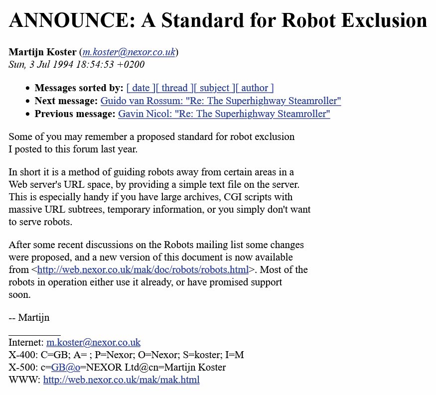 Martijn Koster je leta 1994 takole napovedal robots.txt.