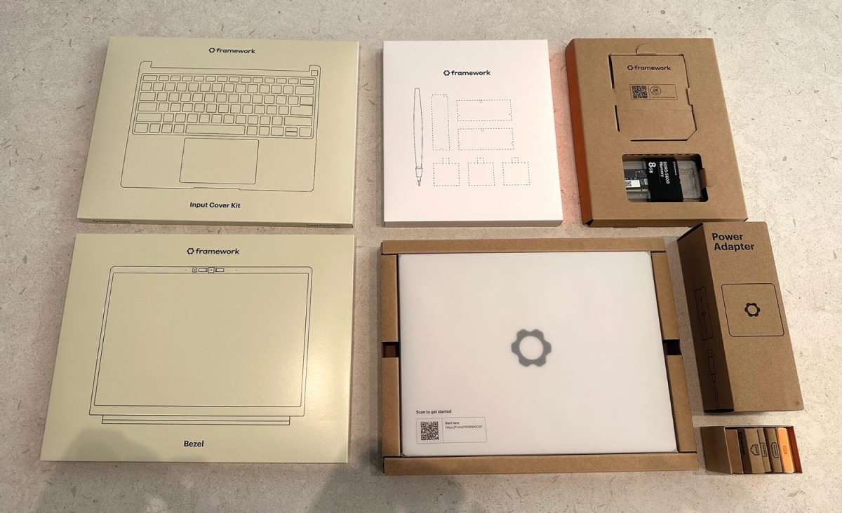 Ko smo prejeli naročeni računalnik, smo bili pripravljeni – prenosnik dobimo v kosih in potrebnega je nekaj dela, preden ga bomo lahko prvič zagnali. Vseeno nas je presenetilo število škatel in škatlic, ki smo jih prejeli, k sreči je bila vsa embalaža papirnata. Da, med vsemi sestavnimi deli ni bilo prav nobenega shranjenega v plastiki, zato je mogoče vso embalažo ekološko zavreči med odpadni papir.