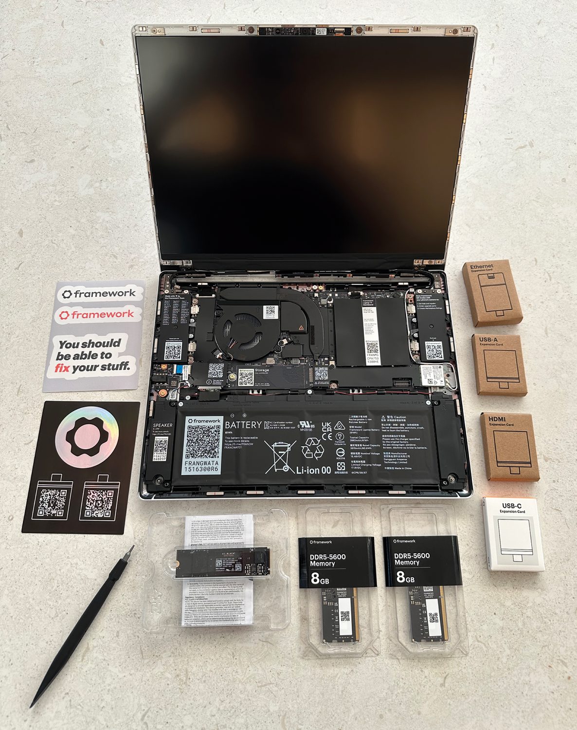 Da smo lahko prenosnik zagnali, smo morali vstaviti ploščici pomnilnika, nato smo namestili in privili diskovni pogon NVMe M.2. Za to nam ni bilo treba iskati primernega izvijača, saj je priložen. Potem smo z enim samim kablom priklopili tipkovnico in namestili magnetni okvir za zaslon. Ko je računalnik že skoraj pripravljen, vstavimo še razširitvena vrata – v našem primeru so to bili po en vhod USB-C in USB-A, vmesnik HDMI ter omrežni priključek. Za zadnjega pri naročanju nismo bili pozorni na velikost, saj je prenosnik pretanek, da bi bil vgrajen, zato precej neestetsko štrli iz ohišja računalnika. Lepo bi bilo, če bi nas spletna stran na to opozorila. Škoda, da nismo raje naročili dodatnih vrat USB-C, prek katerih prenosnik napolnimo z električno energijo. Ta ima sicer štiri mesta za razširitvena vrata, ki jih izberemo sami in jih lahko poljubno menjamo. To je več kot pri MacBook Air, a manj kot pri MacBook Pro.