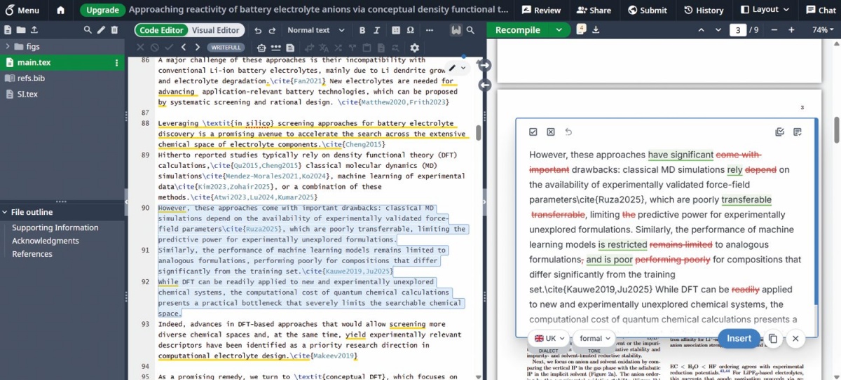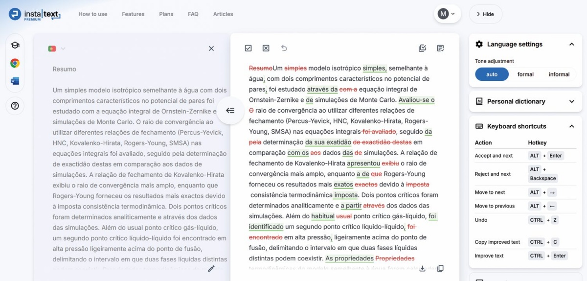 Zadnja možnost je uporaba na spletnih straneh, za kar potrebujemo vtičnik za brskalnik, ki je na voljo za Chrome in Edge. Žal so uporabnike Firefoxa pustili na cedilu, kar pa je pri vtičnikih že kar pogosto. Vtičnik tudi ni oblikovan tako, da bi deloval na katerikoli spletni strani, ki ima vnosno polje za besedilo, temveč le na podprtih. To so Google Docs, Gmail, Outlook, a tudi WhatsApp, Instagram, X, Facebook, Linkedin in celo Overleaf (kar bo razveselilo vse akademske uporabnike LaTeXa). Uporaba je podobna kot v Wordu, in sicer z miško označimo želene odstavke, nato pa pritisnemo Ctrl + D. Pojavilo se bo okno s predlaganimi izboljšavami, ki jih sprejmemo ali zavrnemo in nato skopiramo v glavni dokument.