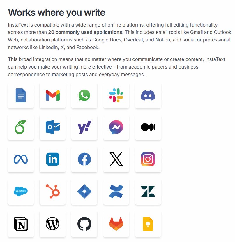 InstaText lahko uporabljamo v treh okoljih. Najpreprostejši način je obisk spletne strani instatext.io, ki ima dve okni. V levo skopiramo (ali napišemo) besedilo in izberemo jezik (angleško, nemško, francosko, italijansko, portugalsko, špansko in pri nas še slovensko), nato se pa ob kliku gumba Improve text na desni izpiše popravljeno besedilo. InstaText striktno popravlja le črkovanje, slovnico in slog, kar vključuje tudi vrstni red, besedišče in podobno.