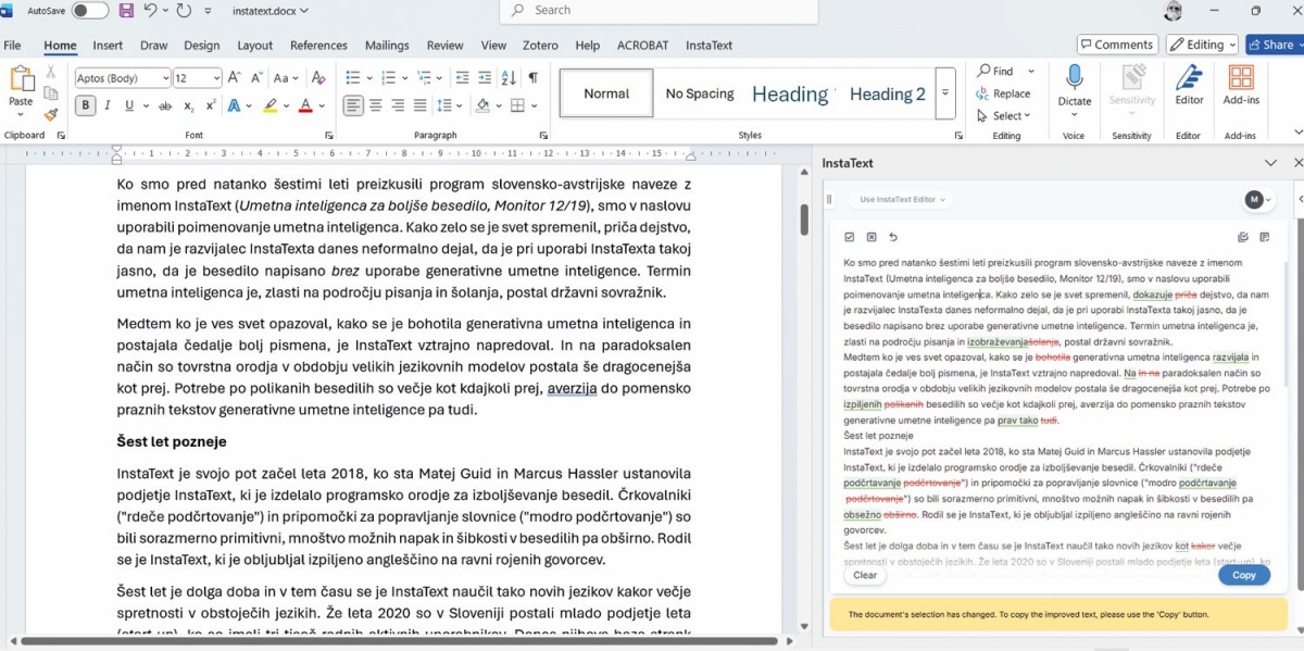 Kaj dejati o InstaTextu? Vedno sem bil zagovornik specializiranih orodij in v tem pogledu mi je InstaText bistveno bliže kot generativna umetna inteligenca. Pri njem je mogoče ceniti zlasti ponovljivost rezultatov in tudi preglednost, saj popravke prikaže v besedilu in pri vsakem nudi pregledno odločitev, ali ga bomo upoštevali. Še vedno ni brez napak in mu slepo ne gre verjeti – kakor tudi ne človeškim lektorjem, ko govorimo o strokovni terminologiji –, a temu niti ni namenjen. InstaText je zelo dobro orodje, ne nadomestek lastne pameti. Naj tako tudi ostane.