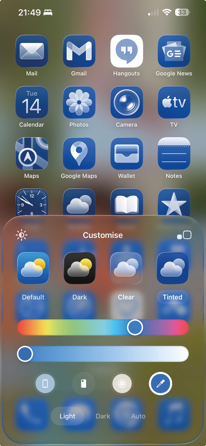 Če daljši pritisk prsta izvedemo na že odklenjenem zaslonu z ikonami programov in tam izberemo Edit / Customize, lahko izbiramo med različnimi možnostmi videza ikon. Ena izmed zanimivejših novosti je možnost Clear, kjer ikone postanejo prosojne in steklenega videza. Privzeta nastavitev Default prikazuje običajne večbarvne ikone, a z novo, elegantno stekleno plastjo, možnost Tinted pa jih obarva z enotnim odtenkom, ki ni povsem prosojen, ampak daje bolj mehko, zamegljeno podobo. Pri nastavitvi Tinted lahko z drsnikom izberemo barvo, ki se ujema s telefonom ali z ovitkom.