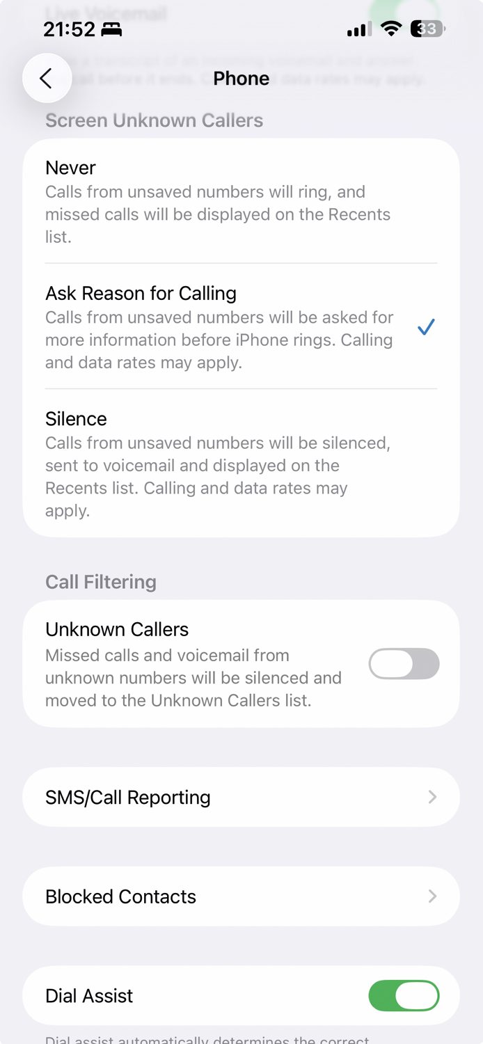 Nova zaščita pred nadležnimi klici ni vezana na jabolčno inteligenco in si jo lahko omislimo tudi na starejših telefonih. Gre za funkcijo Ask Reason for Calling, ki deluje kot digitalni vratar. Ko nas pokliče številka, ki ni v shranjenih stikih, se vključi pomočnici Siri podoben glas, ki samodejno sprejme klic in klicatelja prosi, da pove svoje ime in razlog klica. Sami medtem na zaslonu vidimo prepis njunega pogovora in se lahko odločimo, da klic sprejmemo, odgovorimo nanj s sporočilom ali ga zavrnemo. Tovrstno uslužnost si omislimo z nastavitvijo Settings / Apps / Phone / Screen Unknown Callers / Ask Reason for Calling. Če nastavitve sprva ne vidimo, preverimo, ali sta ustrezno nastavljena regija in jezik pod Settings / General / Language & Region. Nastavimo ju na English ter United Kingdom in zadeva bi morala delovati. Zmožnost predstavlja zlato sredino med popolno blokado neznanih klicev ter stoodstotno dostopnostjo za vse klicatelje. Primerna je za vse, ki si želimo več nadzora brez strahu, da bi spregledali pomembne klice.