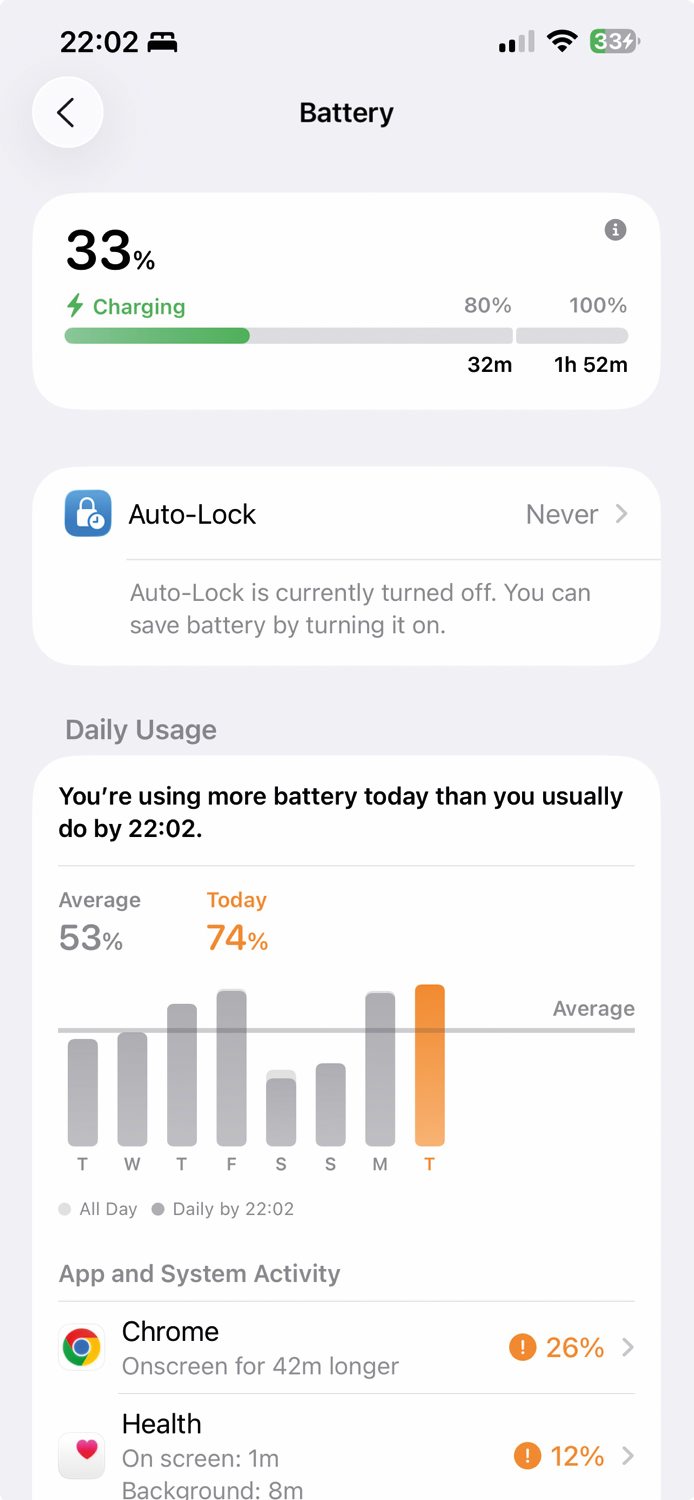 Ko priključimo telefon na polnilnik, se na zaklenjenem zaslonu nad uro prikaže informacija o tem, koliko časa bo trajalo, da se baterija napolni do 80 odstotkov in nato do 100. Enako informacijo nam razkrije obisk nastavitev Settings / Battery. Gre za majhno, a zelo priročno novost, ki odpravi ugibanja in nam pomaga bolje načrtovati, koliko časa potrebujemo za hitro dopolnitev baterije, preden se odpravimo od doma. V iOS 26 je Apple uvedel novo funkcijo Adaptive Power, ki se nahaja v nastavitvah Settings / Battery / Power Mode. Namesto da bi se morali odločati med običajnim načinom ali majhno porabo, se telefon zna samodejno prilagajati naši dejavnosti. Če doma poslušamo glasbo ali beremo novice, sistem samodejno zmanjša porabo energije tako, da omeji procese v ozadju. Po drugi strani pa, ko igramo igre ali snemamo videoposnetke, iphone samodejno poveča zmogljivost, da zagotovi najboljšo mogočo izkušnjo. Gre za sistem, ki nam omogoča, da pozabimo na ročno upravljanje porabe baterije.