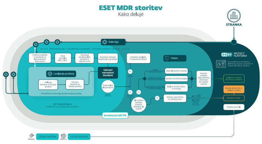 ESET v storitvah MDR uporablja večslojne rešitve za odkrivanje groženj. Učinkovitost teh rešitev nenehno potrjujejo najvišji rezultati na neodvisnih testiranjih od Mittre ATT&CK do AV-TEST, AV-Comparatives in SE Labs ter povratne informacije uporabnikov na platformah Gartner Peer Insights ter G2. Letos je ESET dosegel nov mejnik pri delovanju storitev MDR. Na podlagi podrobne analize delovanja svojih storitev upravljanega odkrivanja in odzivanja je odkril, da je dosegel povprečni čas trajanja MTTR samo 5 minut in 51 sekund. S tem je prekosil najbližjo konkurenco, ki ima javno objavljene podatke o MTTR, za več kot 25 odstotkov, pri čemer se pri ostali konkurentih, ki objavljajo ta kazalnik, MTTR začne pri 18 minutah, v povprečju pa znaša 22 minut! »ESET-ovi odzivni časi so za zdaj nedosegljivi za druge ponudnike storitev MDR in njihove 'tovarniške' SOC-e ter tudi za ponudnike upravljanih storitev kibernetske varnosti in še posebej za ekipe v notranjih varnostno-operativnih centrih podjetij,« je opozorila Petra Veber. Poleg rekordnega MTTR pri ESET MDR izstopa tudi čas zaznave grožnje. Ta namreč traja manj kot minuto. V tem času storitev za posamezni zaznani dogodek izvede analizo in presojo grožnje ter kreira opozorilo, s katerim se začne merjenje MTTR. To pomeni, da v primeru ESET MDR traja celoten proces od zajema do razrešitve grožnje manj kot sedem minut.
