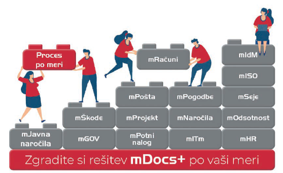 mDocs+ je modularna in prilagodljiva rešitev, ki se prilagaja razvoju organizacije. Zasnovana je kot nadgradnja preverjenega dokumentnega sistema mDocs, z referencami doma in v tujini v različnih panogah – od industrije in financ do zdravstva in javne uprave.