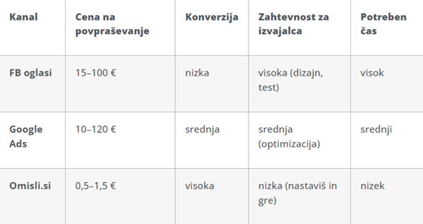 Primerjava oglaševalskih kanalov.
