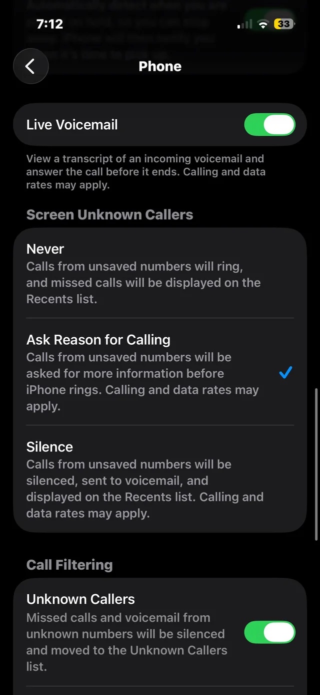 Funkcija z imenom Ask Reason for Calling deluje kot digitalna receptorka, ko nas pokliče nekdo, ki ni shranjen v naših stikih, se iPhone avtomatsko oglasi in prek vljudnega avtomatiziranega sporočila pozove klicatelja, naj razkrije ime in razlog za klic. Medtem ko klicatelj odgovarja, se njegov odziv v živo prevede v besedilo, ki se prikaže na zaslonu, nakar se lahko odločimo, ali bomo klic sprejeli, zavrnili ali zahtevali dodatne informacije. Gre za nadgradnjo dosedanje možnosti Silence Unknown Callers, ki je neznane številke zgolj preusmerila na telefonski predal brez povratne informacije.
