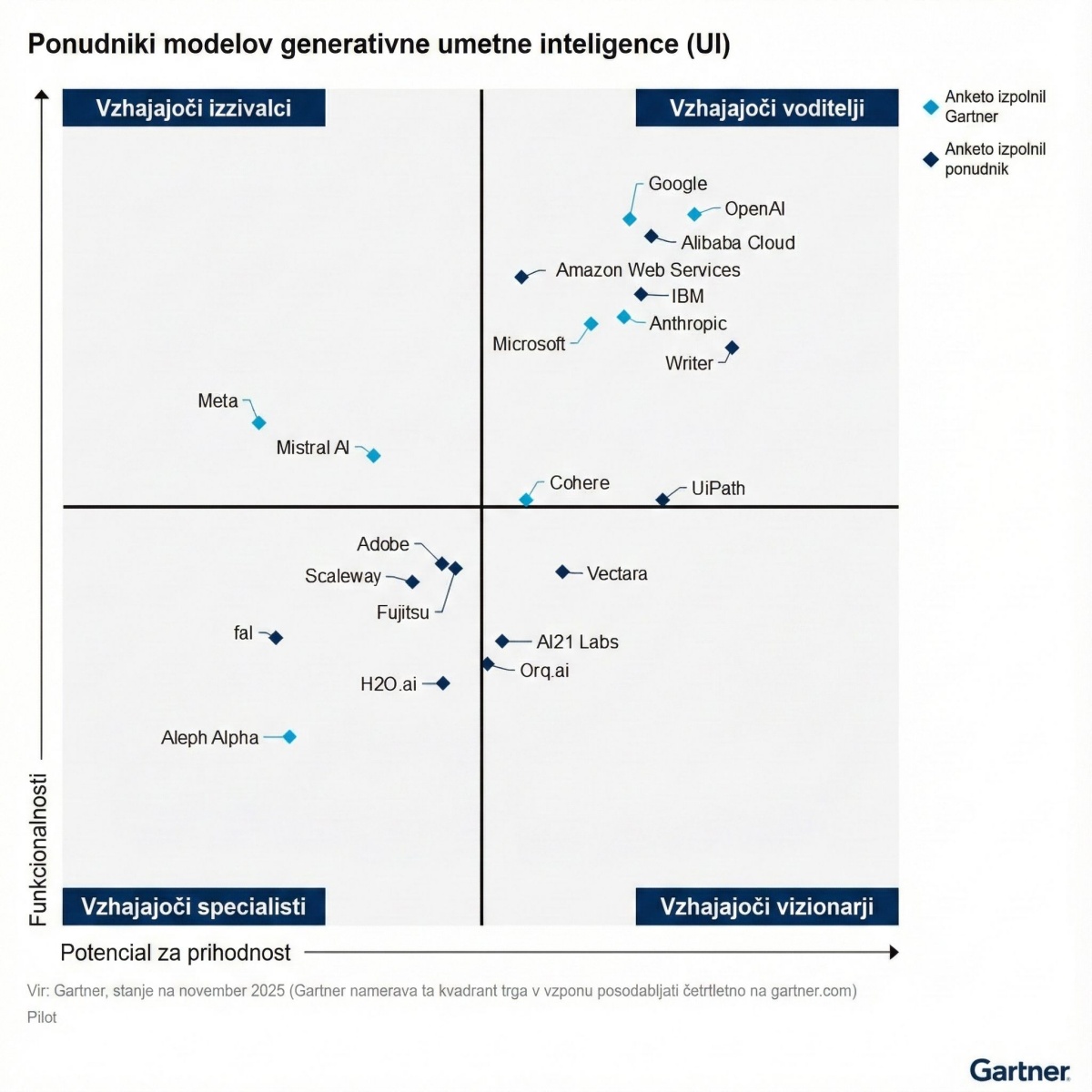 Ta razvrstitev je pomembna, saj označuje, da je OpenAI prešel iz faze raziskav in eksperimentiranja v fazo resne uporabe v podjetjih. Gartner v svojem kvadrantu, razdeljenem po trenutnih funkcionalnostih in prihodnjem potencialu, navaja vodilne ponudnike, med katere poleg OpenAI sodijo tudi največja imena, kot so Google, Amazon Web Services, IBM, Anthropic in Microsoft.